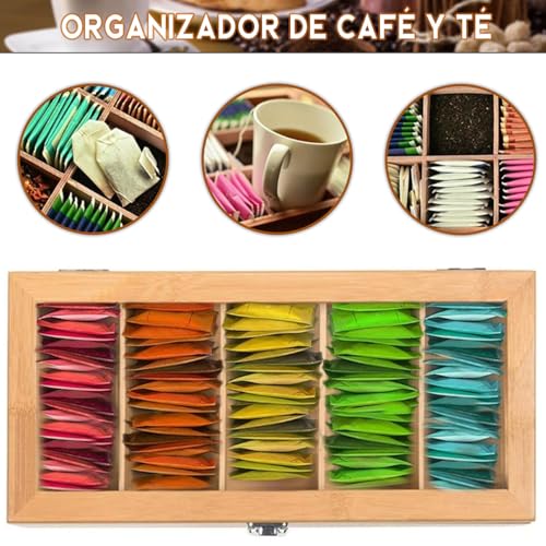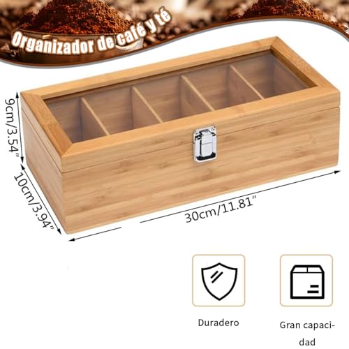- حل تخزين فعال: تم تصميم صندوق تخزين الشاي الخاص بنا بـ 5 مساحات تخزين، مما يوفر مساحة واسعة لتخزين أكياس الشاي الخاصة بك بأناقة. قل وداعًا للأدراج الفوضوية والخزائن غير المنظمة، وحافظ على الشاي المفضل لديك منظمًا بشكل مريح وفي متناول اليد