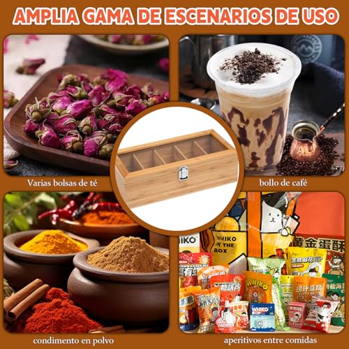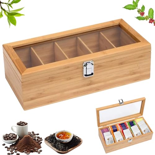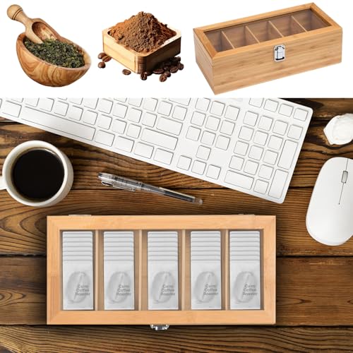 UBRICI - صندوق تخزين الشاي مع 5 مساحات تخزين، صندوق منظم للقهوة والتوابل مع غطاء، رف تخزين زجاجي شفاف للمكتب