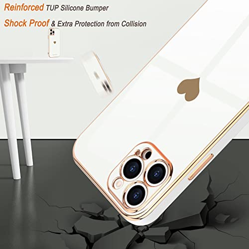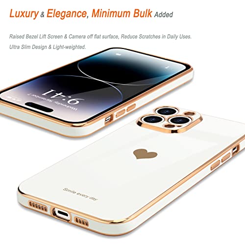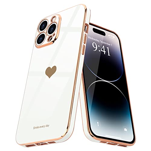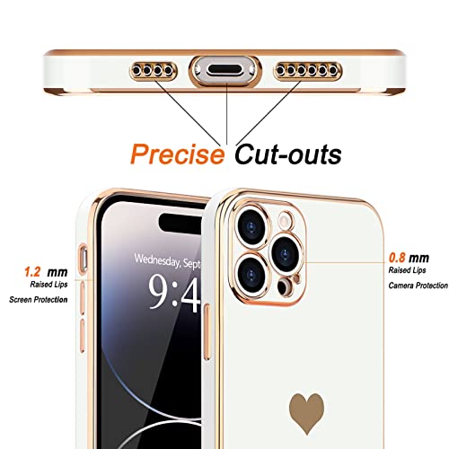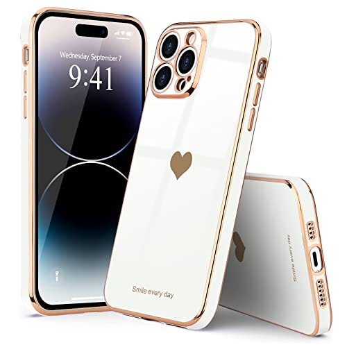 Teageo - جراب اي فون 14 Pro خلفي مضاد للصدمات من السيليكون الناعم مع حافة مرتفعة لحماية الكاميرا، مطلي بالبلينج الفاخر مع تصميم قلب لطيف للبنات والنساء، متوافق مع موبايل ايفون 14 برو ماكس من تيجيو لون ابيض