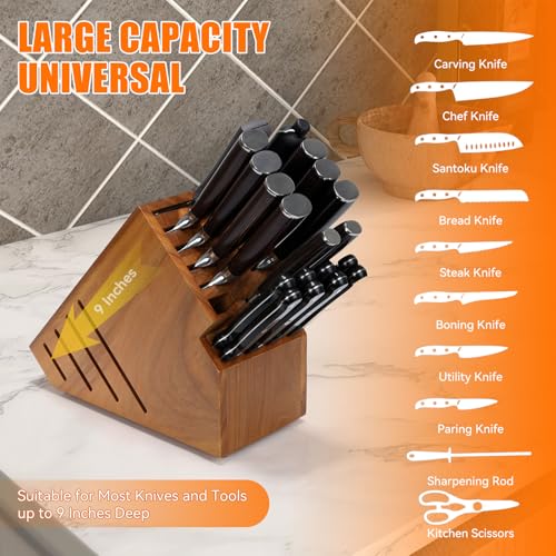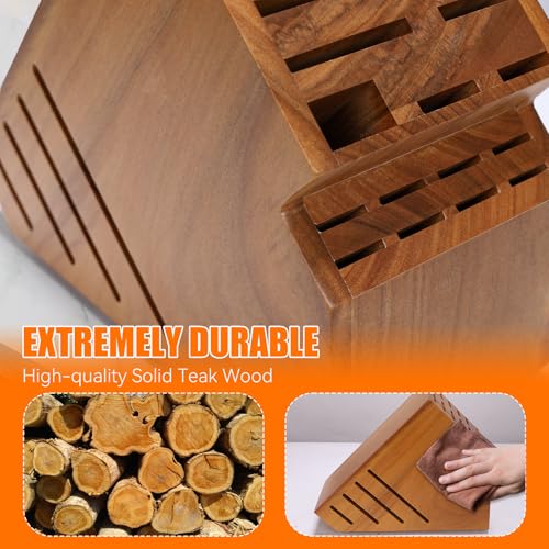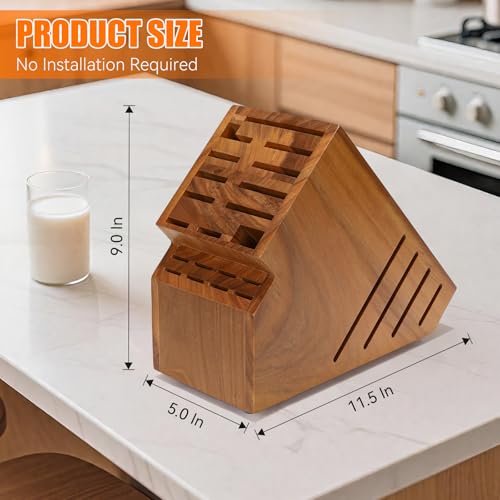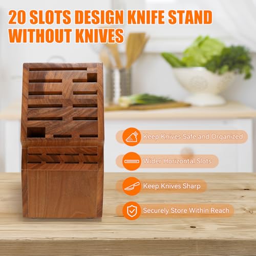 ACTESE - حامل سكاكين من خشب الساج بدون سكاكين، منظم سكاكين خشبي عالمي كبير بـ 20 فتحة، مع فتحات واسعة وقاعدة آمنة لتنظيم سطح المطبخ