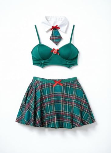 Generic - طقم لانجيري كاروهات بلون أزرق مخضر - بلوزة قصيرة مثيرة وجيبة مطابقة مع ياقة زينة وربطة فيونكة، مثالية للعب الأدوار الحميمة والحفلات التنكرية