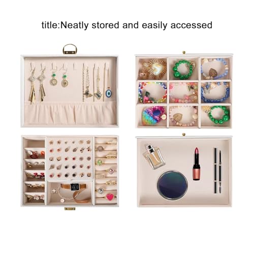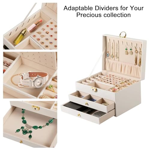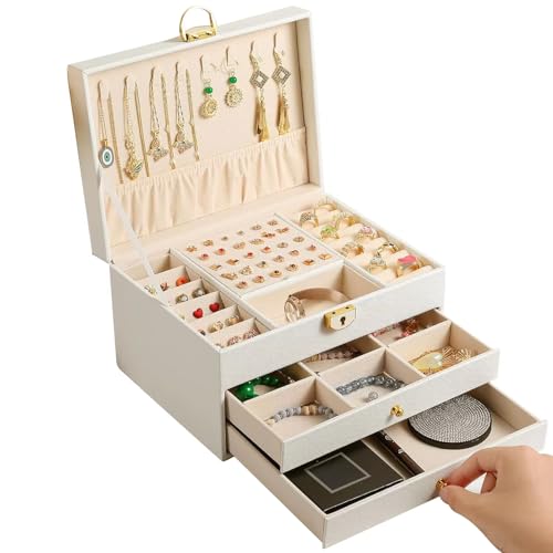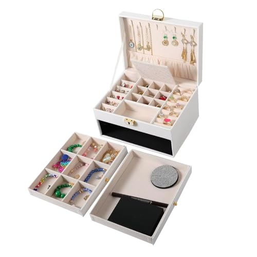 TECHZONE - صندوق منظم مجوهرات قابل للقفل مكون من 3 طبقات ودرجين - شنطة تخزين بدرج قطيفة للنساء لتنظيم الاكسسوارات من تيكزون، لون أبيض