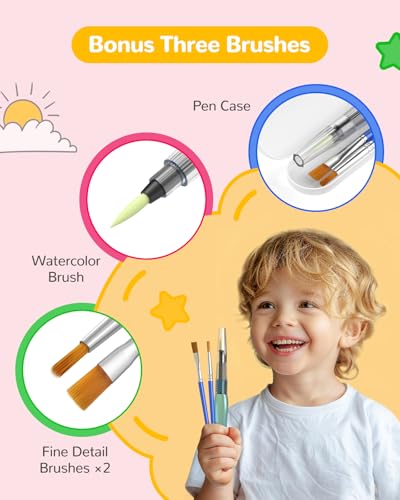 - مجموعة متنوعة من الفرش والتحكم بدون مجهود: تتضمن مجموعة الطلاء بالألوان المائية للأطفال فرشاة مائية وحجمين مختلفين من فرش الطلاء، مثالية للرسم والأعمال الفنية التفصيلية. مصممة للإمساك المريح بأيدي صغيرة، تضمن هذه المجموعة أن يتمكن طفلك من الرسم والاستمتاع بعمليته الإبداعية بسهولة، حتى عند مشاركة لحظات الرسم مع الأصدقاء.
