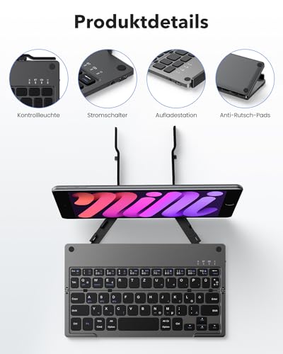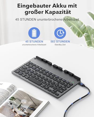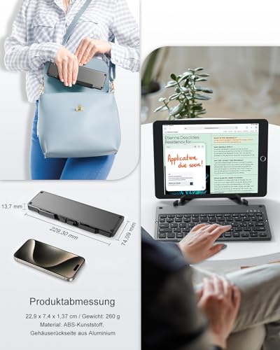 - لوحة مفاتيح بلوتوث قابلة للطي مع حامل تتميز بتصميم فائق النحافة وسهل الحمل، ويبلغ وزنها 260 جم. عند طيها، تصبح لوحة المفاتيح الميني بحجم الموبايل تقريبا، خفيفة الوزن وسهلة الحمل، ويمكن طيها ووضعها في الجيب أو الشنطة وأخذها معك بسهولة. لوحة المفاتيح المزودة بحامل مغناطيسي مناسبة أيضا للاستخدام في المكتبات والمقاهي والطائرات أو في أي مكان آخر.