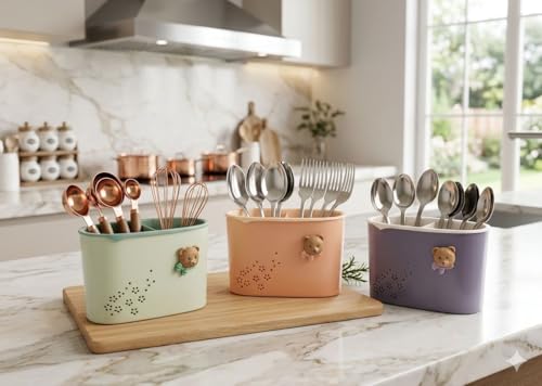 Generic - منظم أدوات المطبخ بتصميم دبدوب، حامل معالق وشوك وسكاكين مع فتحات تهوية، ألوان باستيل، مقسم من الداخل