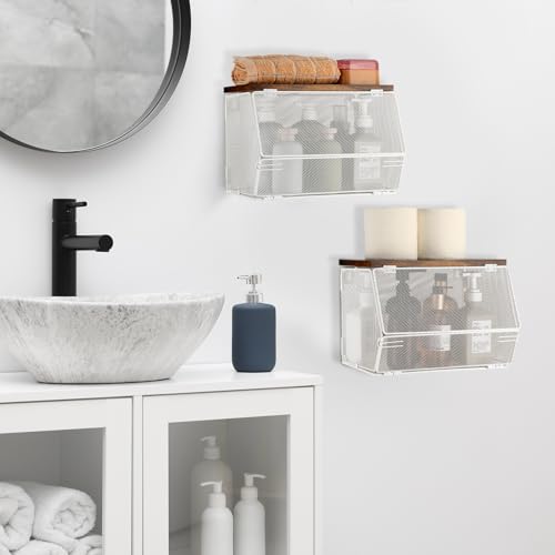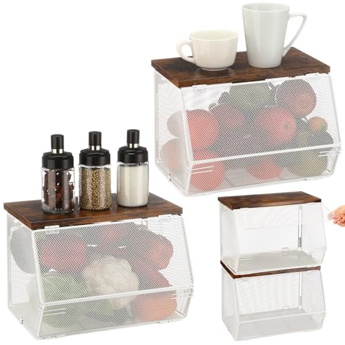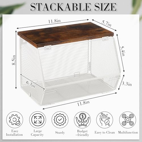 Teenyyou - سلة تخزين شبكية معدنية قابلة للتكديس مع غطاء خشبي من تيني يو، سلة معلقة على الحائط لتخزين الفواكه والوجبات الخفيفة والخضروات لطاولة المطبخ والحمام بعرض 7.1 انش وطول 11.8 انش (ابيض، غير قابلة للازالة)