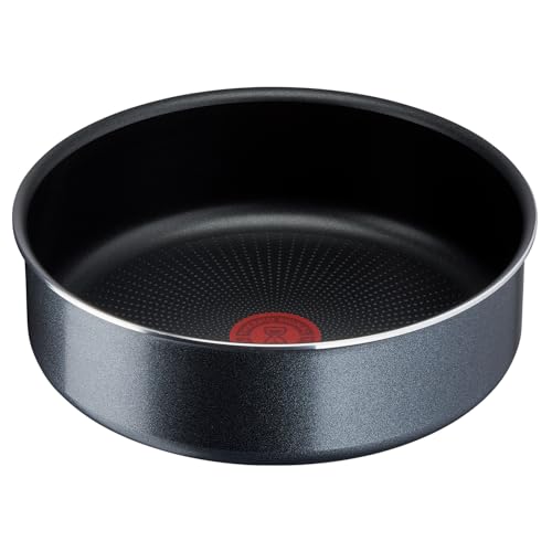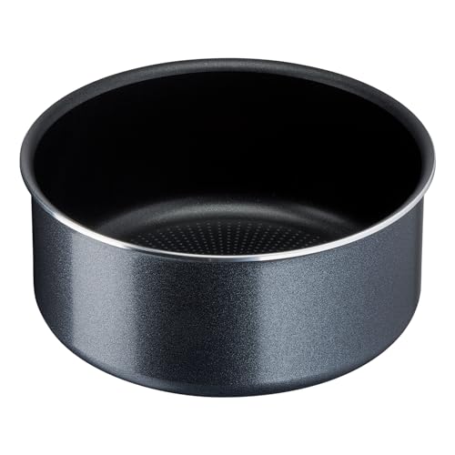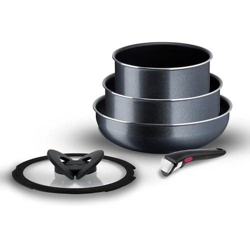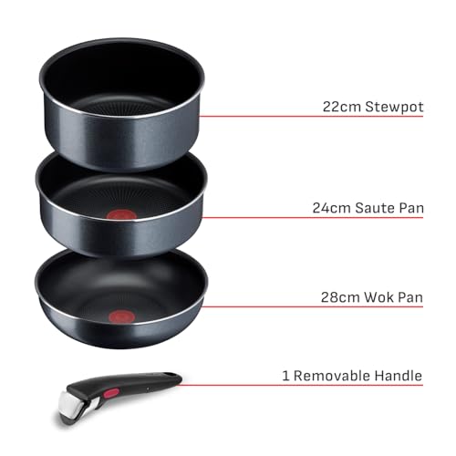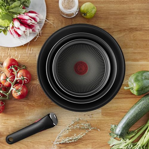 T-Fal - طقم أواني الطبخ من تيفال، مصنوع من الألومنيوم مع طلاء تيتانيوم باللون الأسود، يتميز بسطح غير لاصق ومقبض قابل للفك وتصميم قابل للتكديس، مكون من 3 قطع