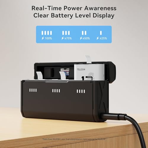 - 【مؤشر شحن ذكي حصري】 في كثير من الأحيان عندما تحتاج إلى معرفة مستوى البطارية، تحتاج إلى وضعها في الكاميرا للتحقق منها. مع شاحن تيليسن المحمول، يمكنك رؤية مستوى الطاقة بشكل أسرع وأسهل مع 4 مؤشرات ذكية مدمجة تخبرك بمقدار الطاقة المتبقية في 4 مستويات.