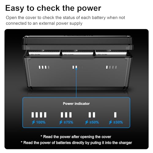 - 【مؤشر شحن ذكي حصري】عادةً عندما تحتاج إلى معرفة طاقة البطارية تحتاج إلى وضعها في الكاميرا والتحقق منها. مع شاحن الجيب تيليسن يمكنك رؤية الطاقة بسرعة أكبر وسهولة، فهو مصمم بـ 4 مصابيح مؤشر ذكية لإخبارك بمقدار طاقة جو برو المتبقية في 4 مستويات.