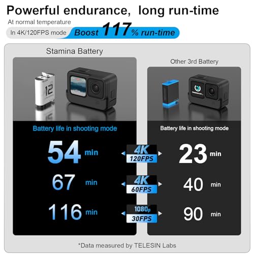 - 【أداء أفضل في درجات الحرارة المنخفضة】مع بطارية تيليسن اندورو يمكنك تشغيل الكاميرا في بيئة درجة حرارة منخفضة أقل من -20 درجة مئوية - -60 درجة مئوية. حتى أنه يعمل بشكل أفضل من الأداء الأصلي، بيانات اختبار درجة الحرارة المنخفضة مثل 43 دقيقة/4K120FPS، 58 دقيقة/4K60FPS، 82 دقيقة/108030 إطار في الثانية، بينما البيانات الأصلية هي 43 دقيقة/4K120FPS، 51 دقيقة/4K60FPS، 85 دقيقة/108030 إطار في الثانية.