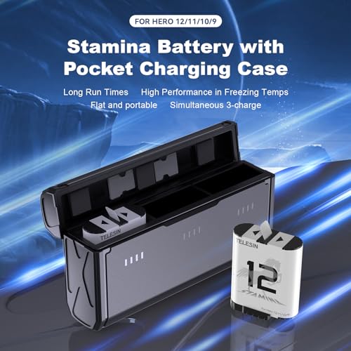TELESIN - بطارية اندورو مع شاحن جيب من تيليسين تدوم طويلا مع مؤشر طاقة ذكي يدعم الشحن السريع لكاميرا جو برو اندورو هيرو 12 هيرو 11 هيرو 10 هيرو 9 اسود