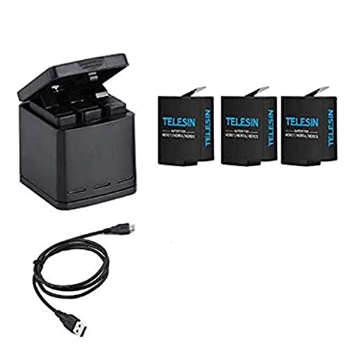 TELESIN - شاحن بطارية بـ3 قنوات من تيليسن وكابل من النوع سي مع 3 بطاريات لكاميرا جوبرو هيرو 5 و6 و7 وصندوق تخزين - أسود