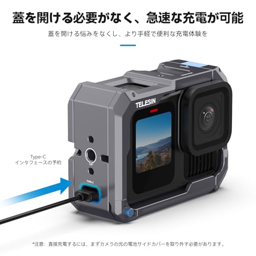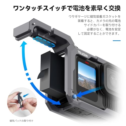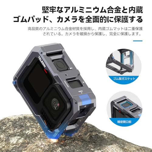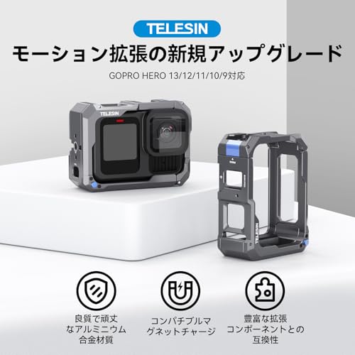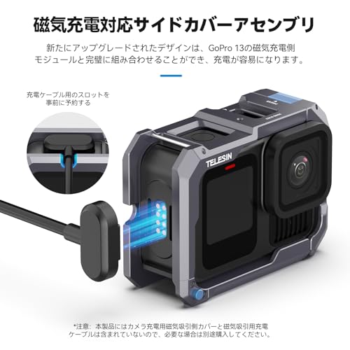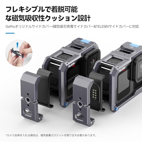 TELESIN - تيليسن قفص مصنوع من خليط معدني من الالومنيوم متوافق مع جوبرو 13/12/11/10/9، متوافق مع غطاء جانبي للشحن بالشفط المغناطيسي، فك سريع، شحن مريح، اطار واقي، اخدود حذاء بارد و1