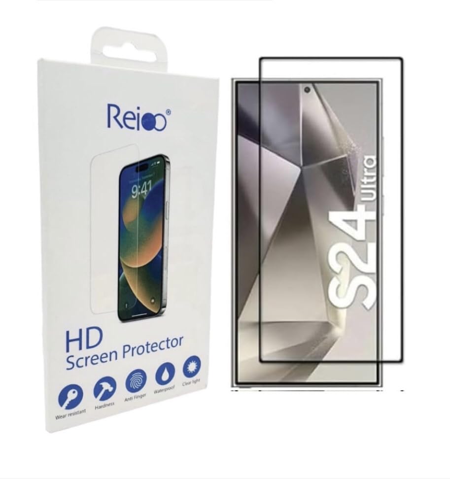 Reioo - شاشة حماية من الزجاج المقوى ريو بطبقة كاملة لموبايل سامسونج جالاكسي S24 الترا الحافة الى شفاف بإطار أسود