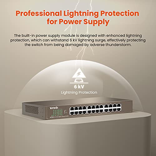 - 【حماية من البرق 6 كيلو فولت】يتميز المفتاح المكون من 24 منفذًا بحماية مدمجة من الصواعق 6 كيلو فولت على جميع منافذ ايثرنت ويدعم الحماية من درجة الحرارة الزائدة والجهد الزائد والتيار الزائد