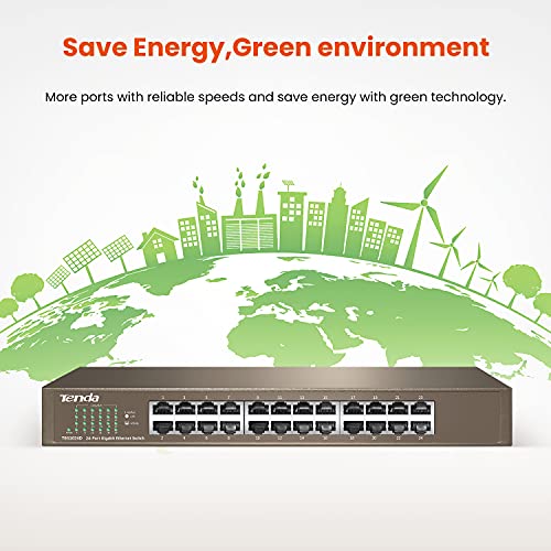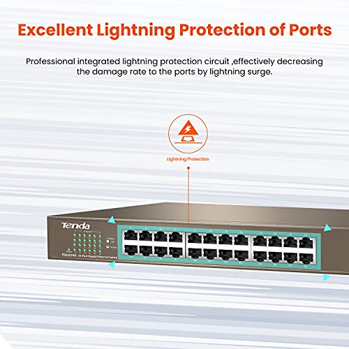 Tenda - سويتش توزيع شبكة ايثرنت به 24 منفذ من تيندا يدعم سرعة 10/100/1000 ميجابايت في الثانية بمنافذ Uplink وRJ45 بقدرة حماية من التيار الزائد 6 كيلفن للمكتب والرف سهل التوصيل والتشغيل لاعمال الرقابة الامنية