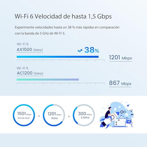 - شبكة واي فاي 6 ثنائي النطاق AX1500: استمتع بالبث والألعاب والتنزيل بسلاسة وثبات بسرعات تصل إلى 1.5 جيجابت في الثانية (1201 ميجابت في الثانية على نطاق 5 جيجاهرتز و300 ميجابت في الثانية على نطاق 2.4 جيجاهرتز).
