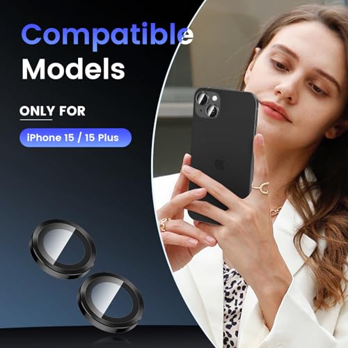 - [حماية آمنة] توفر الحلقة المعدنية المصنوعة من الألومنيوم المستخدم في صناعة الطائرات وواقي الكاميرا المصنوع من الزجاج المقوى بدرجة صلابة 9 طبقة إضافية من الحماية لعدسة كاميرا آيفون 15/15 بلس، مما يبقيها آمنة من الخدوش والغبار والبقع.