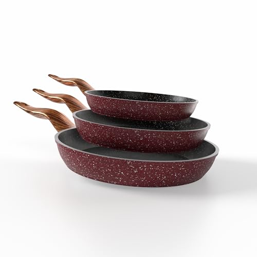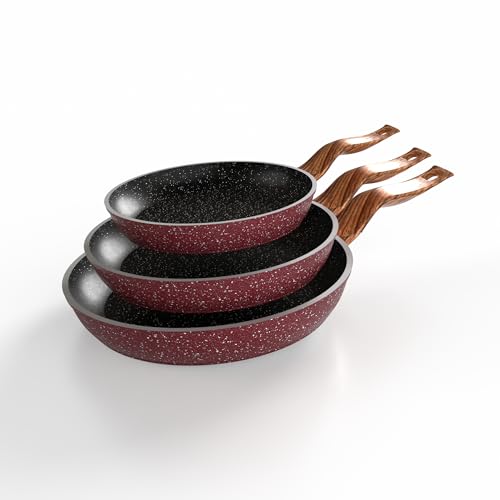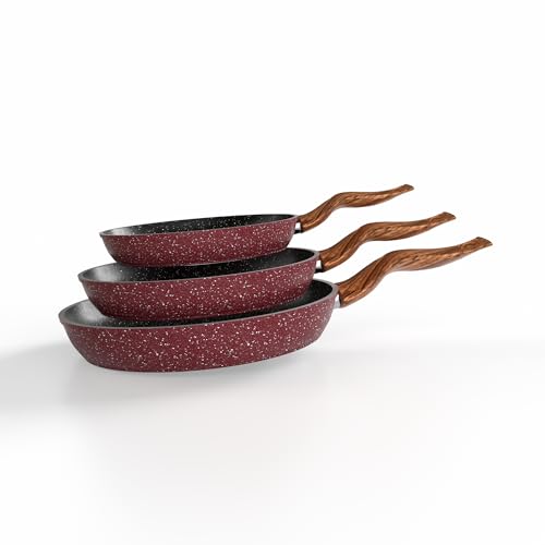 Terynova - طاسة قلي جرانيت من تيرينوفا، هيكل متين لتوزيع الحرارة بالتساوي، طقم من 3 قطع طلاء جرانيت ممتاز مقاوم للالتصاق يضمن سهولة الطبخ والتنظيف بدون مجهود.