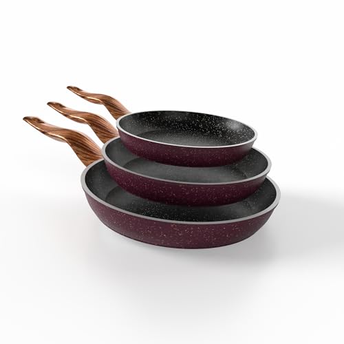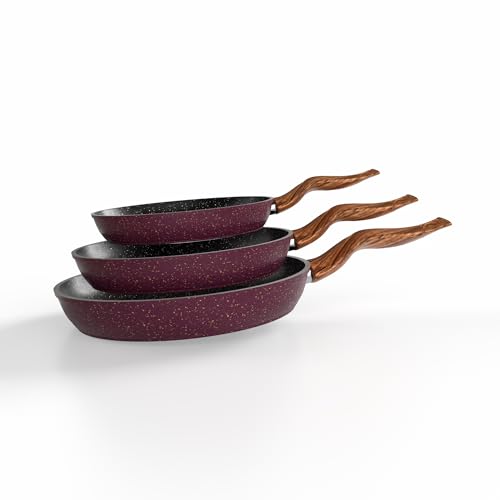 Terynova - طاسة قلي جرانيت غير لاصقة ومتينة وشديدة التحمل مقاومة للخدش وسهلة التنظيف مناسبة للطبخ اليومي من تيرينوفا، لون أرجواني، 3 قطع