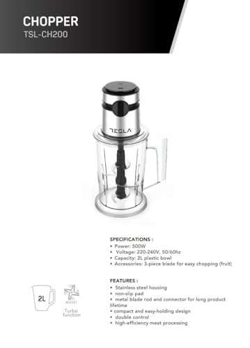 Generic - قطاعة طعام تسلا TSL-CH200 - بقوة 500 واط ، وعاء بلاستيك سعة 2 لتر ، شفرات ثلاثية من الاستانلس ستيل ، تصميم مدمج ، خاصية التربو ، لتحضير اللحوم والخضروات والفواكه