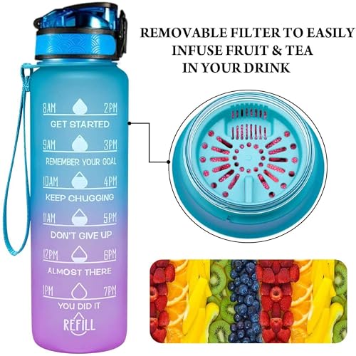 TGT - زجاجة مياه من تي جي تي سبورت مع علامات تحفيزية للوقت، خالية من البيسفينول ايه، من بلاستيك غير سام، مقاومة للتسرب، مصفاة فاكهة للرياضة والنادي الرياضي والاستخدام الخارجي والمدرسة والمكتب