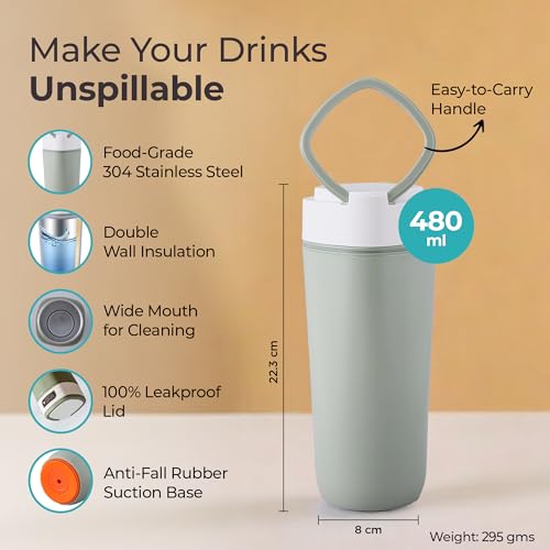 The Better Home - تمبلر سفر مع مقبض من ذا بيتر هوم، مصنوع من الستانلس ستيل، سعة 480 مليلتر، باللون الأخضر، مانع للتسرب مع قاعدة مضادة للانزلاق، عدد القطع: 1