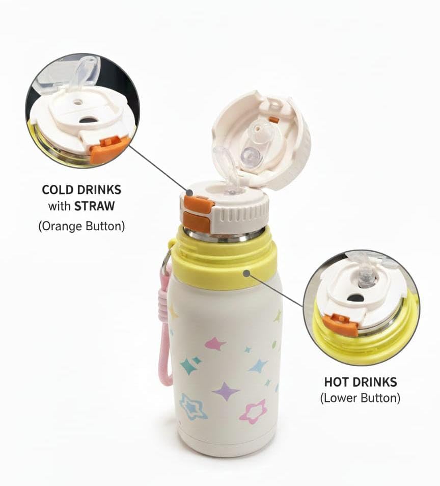 - تصميم بغطاء مزدوج: يوفر خيارين منفصلين للشرب (ماصة للبرد والصب المباشر للساخن) مع زر تحرير مخصص لكل منهما.