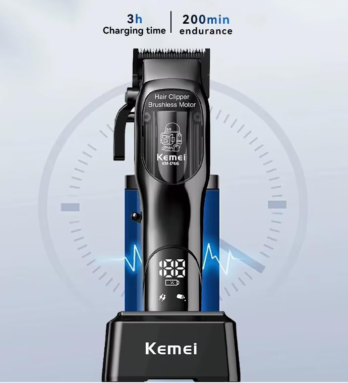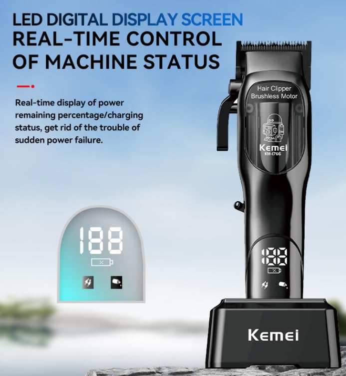 - ماكينة حلاقة من كيمي، عصرية بالكامل للاستخدام الاحترافي في الصالونات بقاعدة شحن وشاشة رقمية مضيئة لعرض حالة الماكينة، KM-1766.
