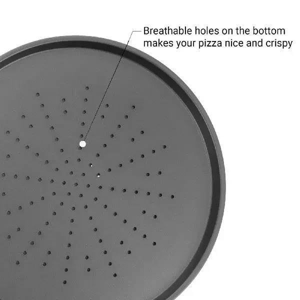 - ✅ توزيع مثالي للحرارة: الخروم الموجودة في الصنية تساعد في توزيع الحرارة بشكل متساوٍ، مما يؤدي إلى تسوية أفضل للبيتزا.