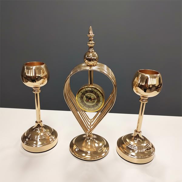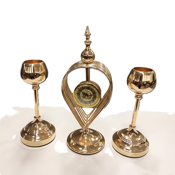 - محتويات المجموعة: تتضمن المجموعة المكونة من ثلاث قطع حاملي شموع متطابقين على شكل كأس وقطعة مركزية مزخرفة مع عرض ساعة مزخرف