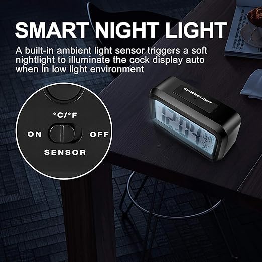 The White Parrot - ساعة منبه رقمية من ذا وايت باروت للطلاب والمنزل والمكتب والشركات مع مستشعر تلقائي التاريخ ودرجة الحرارة اسود بلاستيك عرض 14 × ارتفاع 8 سم الببغاء الأبيض