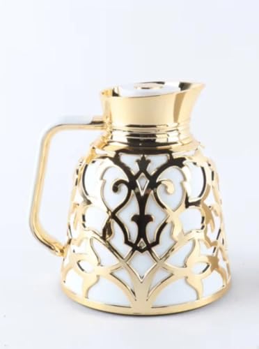 - تصميم فاخر: قارورة حرارية أنيقة باللونين الذهبي والرمادي تتميز بجزء خارجي معدني مزخرف مع أنماط أرابيسك معقدة تضيف لمسة راقية إلى أي طاولة