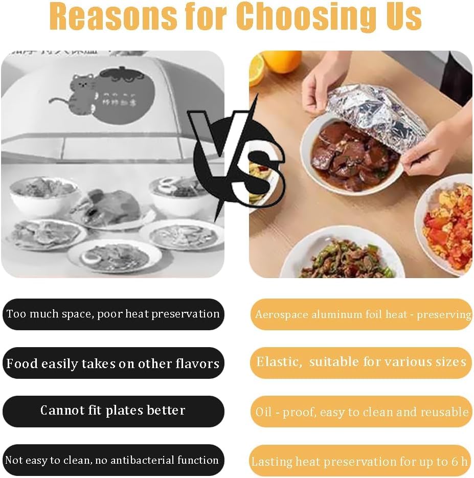 - متعدد الاستخدامات في كل مكان: لا يقتصر على تغطية الأطباق فقط! يمكن استخدامه لتغطية نصف البطيخة أو التفاحة، إغلاق أكواب السفر، تغطية علب الصلصة المفتوحة، أو حتى كغطاء آمن لتسخين الطعام في الميكروويف (دون ملامسة الطعام مباشرة). رفيق مثالي للمطبخ والمكتب والنزهات وحفلات الشواء.