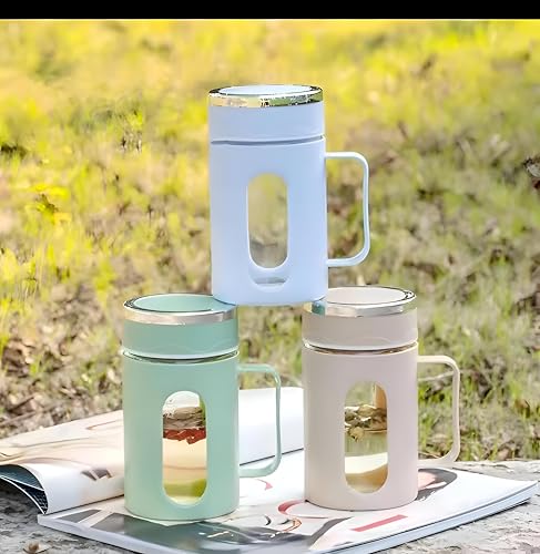 Generic - كوب زجاجي حراري - حاوية مشروبات متينة سعة 480 مل مع مقبض ملون وغطاء امن، مثالية للمشروبات الساخنة او الباردة، سهلة الحمل والتنظيف