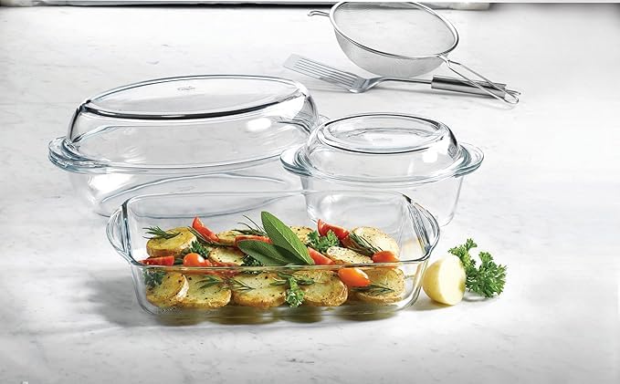 - زجاج حراري عالي الجودة: مصنوع من زجاج حراري متين يتحمل درجات الحرارة العالية ويمكن استخدامه بأمان في الفرن والميكروويف والثلاجة