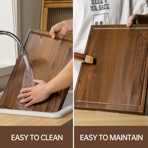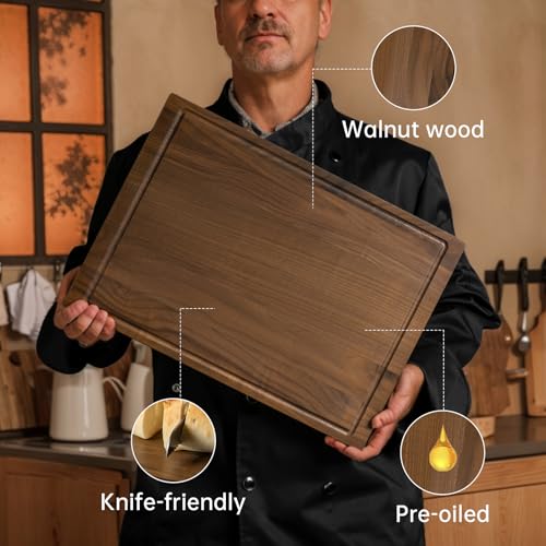 - مادة فاخرة: مصنوعة من خشب الجوز القوي والمقاوم للتشقق ومعالجة مسبقة التزييت تمنحها لمسة نهائية لامعة وتطيل من عمر الخدمة بشكل كبير. إنها ليست قوية فقط؛ كما أنها آمنة غذائيًا بنسبة 100%، مما يمنحك الثقة سواء كنت تقدم الطعام أو تقطع إلى شرائح