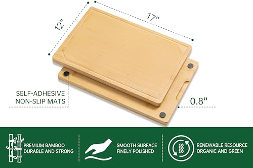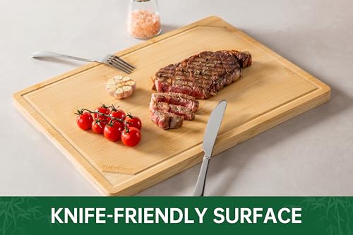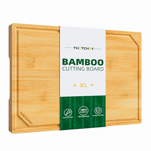 thetchry - لوحات تقطيع من الخيزران العضوي للمطبخ، لوح تقطيع خشبي مانع للانزلاق مع أخدود عصير ومقبض، لوح تقطيع كبير جدًا للحوم، حجم مثالي للتحضير والتقديم، 43.18 سم × 30.5 سم × 1.77 سم من ثيتشري