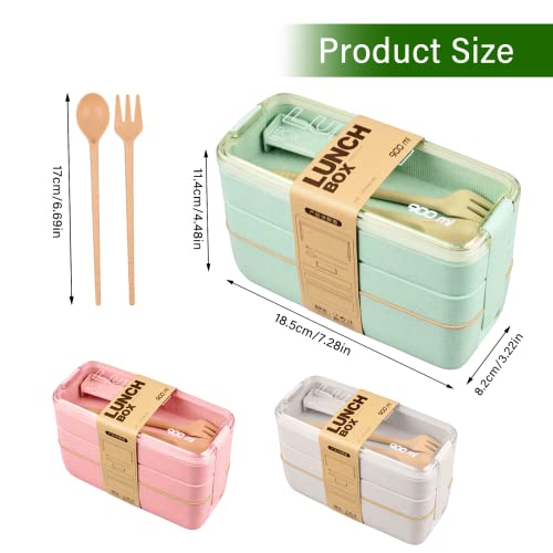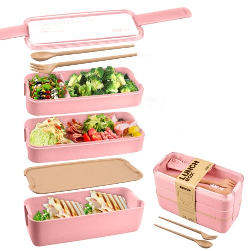 Thingehoy - صندوق غداء بينتو للبالغين والاطفال من ثينجهوي مكون من 3 قطع، صندوق غداء بينتو قابل للتكديس وشوكة وملعقة مجانية (بينك)