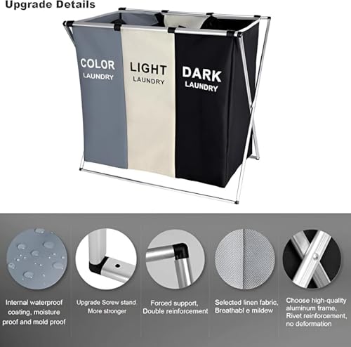 Generic - ثلاث مساحات تخزين - سلة غسيل كبيرة سعة 137 لتر مقسمة إلى ثلاثة أقسام داخلية مع فواصل معدنية؛ نمط أحادي اللون اسود وابيض ورمادي للحفاظ على الملابس منظمة.
