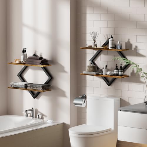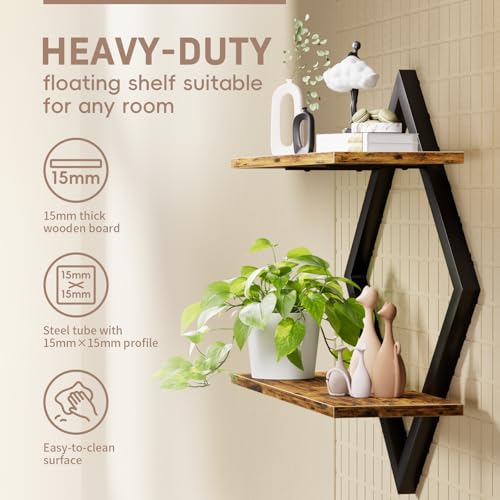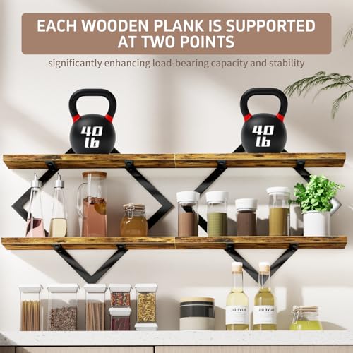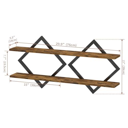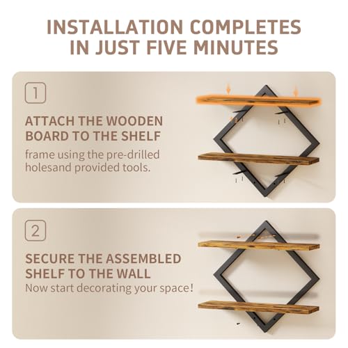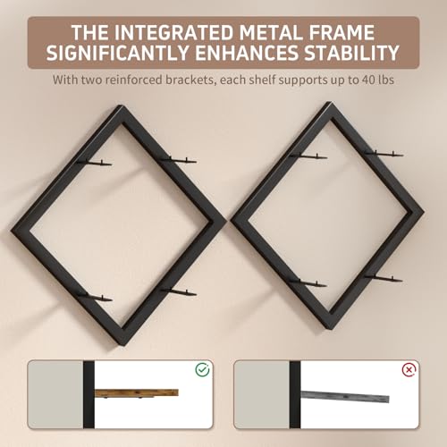 TIFFLOI - طقم حائط عائم جديد مطور برفين مع اطار معدني بدون تجميع من تيفلوي - لوح حديد مقوى يدعم وزن 40 باوند + - ارفف بطبقتين بلون بني ريفي مع تركيب سريع بخطوتين