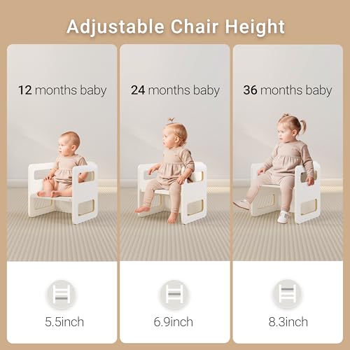 - كرسي قابل لتعديل الارتفاع: يمكن تعديل الكرسي المكعب إلى ارتفاع 5.5 انش، 6.9 انش، 8.3 انش، مما يوفر ارتفاع مقعد مريح للأطفال من سن 8 أشهر إلى 4 سنوات، والذي يمكن أن يرافق الطفل لأكثر من ثلاث سنوات من وقت النمو