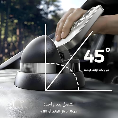 - يتم تمكين التشغيل بيد واحدة من خلال حامل على شكل قبة مع إمالة سلسة بزاوية 45 درجة، مما يجعل إدخال الهاتف وإزالته سهلاً ويحافظ على انتباهك على الطريق.