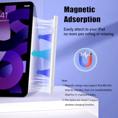 - التوصيل مغناطيسيًا: يسمح التصميم المغناطيسي بتثبيت قلم التابلت على جانب الايباد، وتخزين القلم بشكل أفضل دون تلف ويسهل العثور عليه عند الاستخدام. سهل الاستخدام، اضغط مرتين على مفتاح اللمس العلوي لتشغيل وإيقاف الطاقة. ملاحظة: هذا القلم لا يدعم "رفض راحة اليد" و"وظيفة الإمالة". وظيفة الامتصاص المغناطيسي فقط، لا توجد وظيفة شحن مغناطيسية.