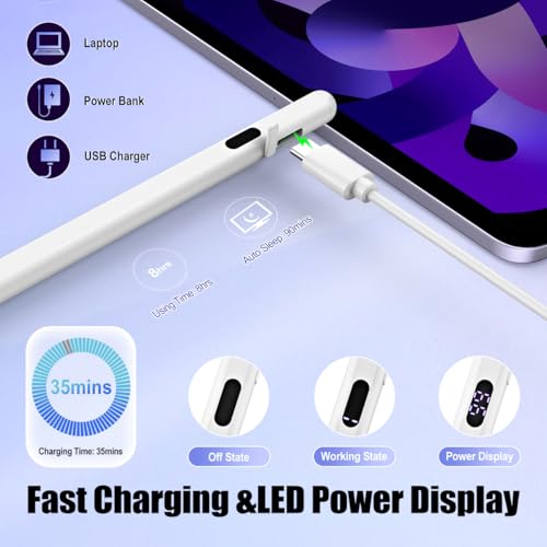 - شحن سريع وشاشة LED للطاقة: مع منفذ شحن من النوع C وبطارية مدمجة، يستغرق الشحن الكامل 35 دقيقة فقط ويمكن أن يعمل بشكل مستمر لمدة 8 ساعات. سيتم إيقاف تشغيل قلم شاشة اللمس هذا تلقائيًا بعد 90 دقيقة من الخمول لتوفير الطاقة. تعرض لوحة LED طاقة البطارية، يمكنك التحقق بوضوح من الطاقة المتبقية للقلم.