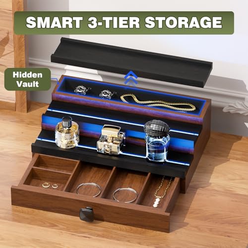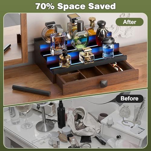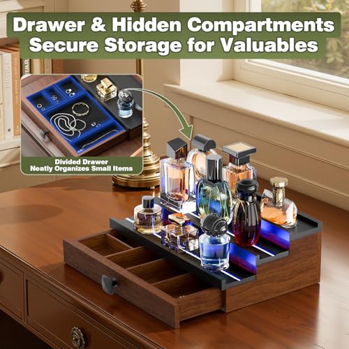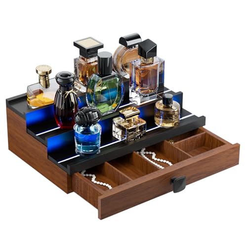 TIRYIUOU - منظم كولونيا للعطور للرجال من تيريو: حامل خشبي من 3 طبقات باضاءة LED، رف عرض خشبي لسطح المكتب مع خزانة، رف تخزين مجوهرات ومستحضرات التجميل واللوشن في غرفة النوم مع درج