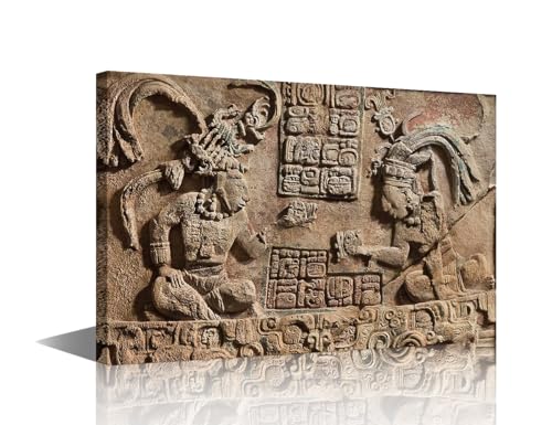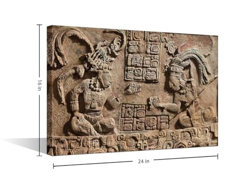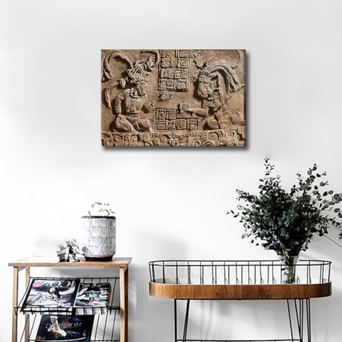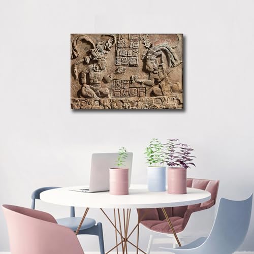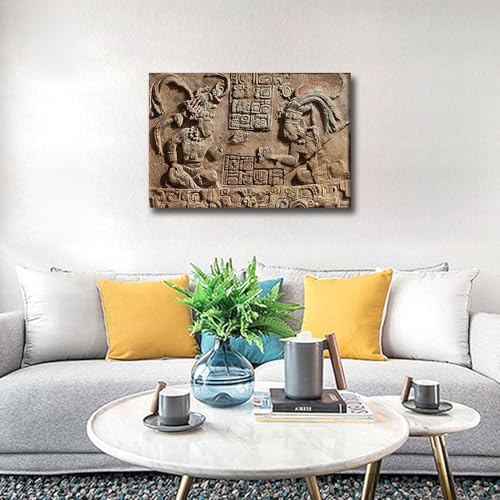 TISHIRON - لوحات جدارية منحوتة هيروغليفية مايان لغرفة المعيشة صور ازتيك مطبوعة على قماش المكسيك لوحة فنية النوم والمكتب قطعة واحدة باطار جيكلي جاهزة للتعليق - 24 × 16 انش