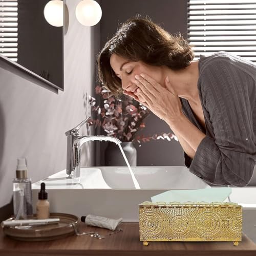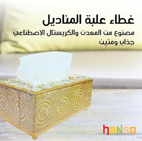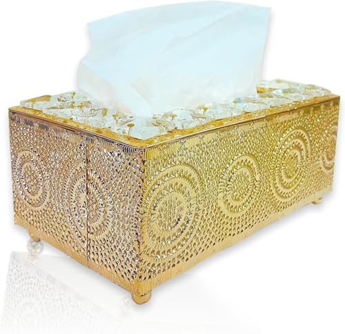- غطاء علبة مناديل أنيق مرصع بالكريستال: يحول صندوق المناديل العادي إلى قطعة ديكور منزلية ذهبية، بحيث تبدو طاولة الصالون جاهزة للضيوف في ثوانٍ.