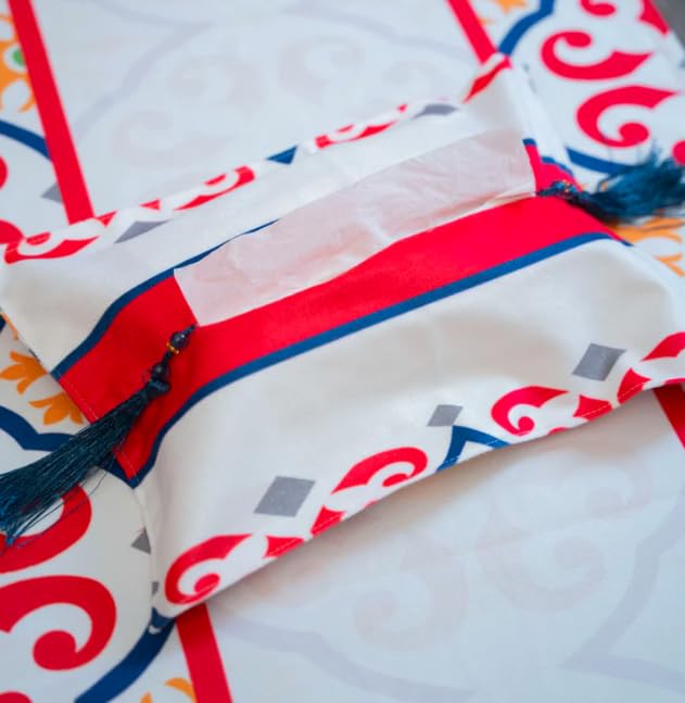 - تصميم زخرفي: يتميز بنمط أحمر وأزرق لافت للنظر مع تفاصيل زخرفية ولمسة شرابة أنيقة تضيف لمسة أنيقة إلى ديكور منزلك