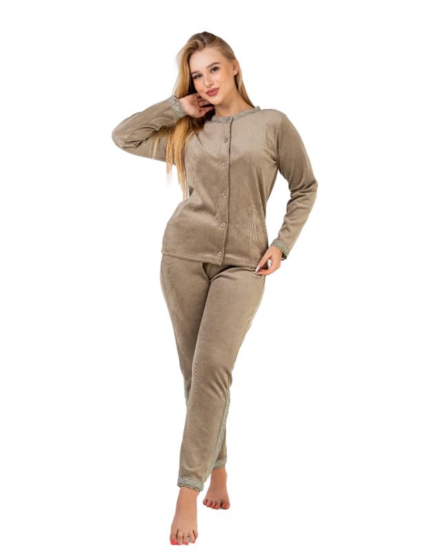 TN - بيجامة من القطيفة بأكمام طويلة وأزرار أمامية للنساء من تي ان فاشن، بني، ميديوم (M)، بيجامة شتوية